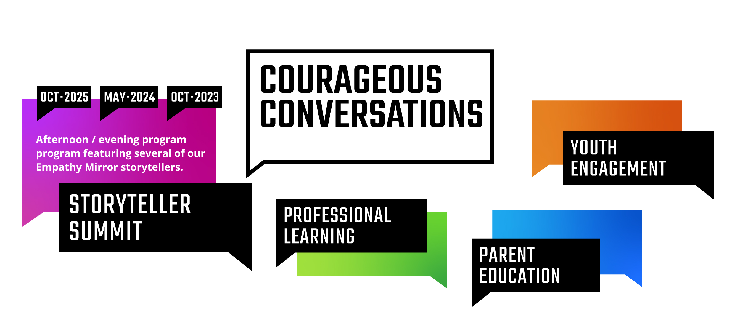 Futures Without Violence created an event series called Courageous Conversations, hosted at the Courage Museum of San Francisco, a brand new space dedicated to helping visitors imagine a world without violence, hate, and discrimination. The series has four offerings — Storyteller Summit, Parent Education, Youth Engagement, and Professional Learning — all designed to help us address some of today’s toughest topics.