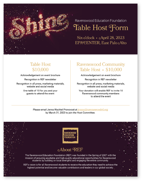 The Ravenswood Education Foundation (REF) hosted a sparkling event themed, “Shine Brighter Together,” in recognition of the community’s collective commitment to Ravenswood students and schools. Thanks to a huge matching sponsor gift, the event raised over a million dollars for the district in one night. With drinks and dinner under the stars, live student music, and an art gallery filled with beautiful student creations, the evening culminated in a glittering dance party that capped off the night in style.